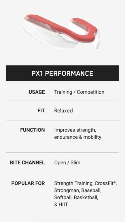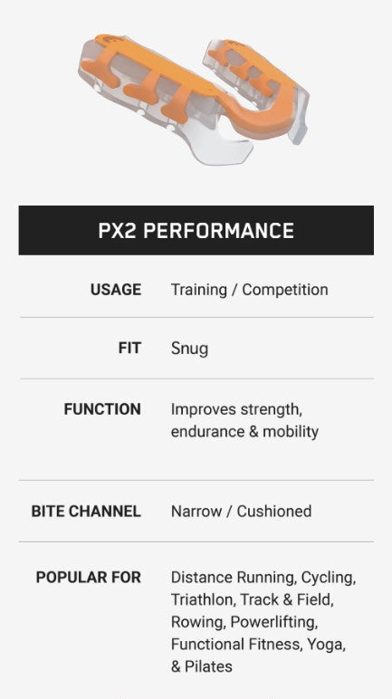 Both models offer the same great performance benefits, but they differ in the way they fit. The PX1 features a wide bite channel for a relaxed fit, ideal for various high-intensity activities. The PX2 has a more secure fit, designed for sports requiring constant, intense movement. If you’re unsure which to choose, we recommend going with the hybrid pack, which includes one of each with a performance case for each mouthpiece. This allows you to use them interchangeably across your different activities.