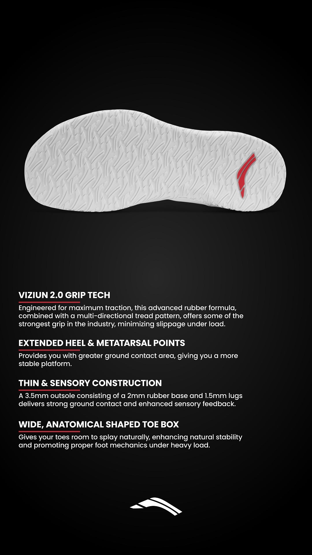multi-directional tread pattern, offers some of the highest grip in the industry, minimizing slippage under load. - Extended Heel & Metatarsal Points: A pioneering feature in Olympic weightlifting footwear, this is the first-ever implementation in flat shoes. It provides a greater ground contact area, offering you a more stable platform.