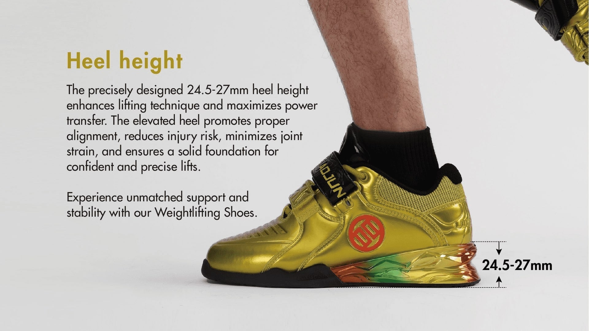 Power and Stability: Designed with a precision-engineered 24.5-27mm heel height, our shoes enhance your lifting technique and maximize power transfer. The elevated heel promotes proper alignment, reduces injury risk, and ensures a solid foundation for confident and precise lifts.